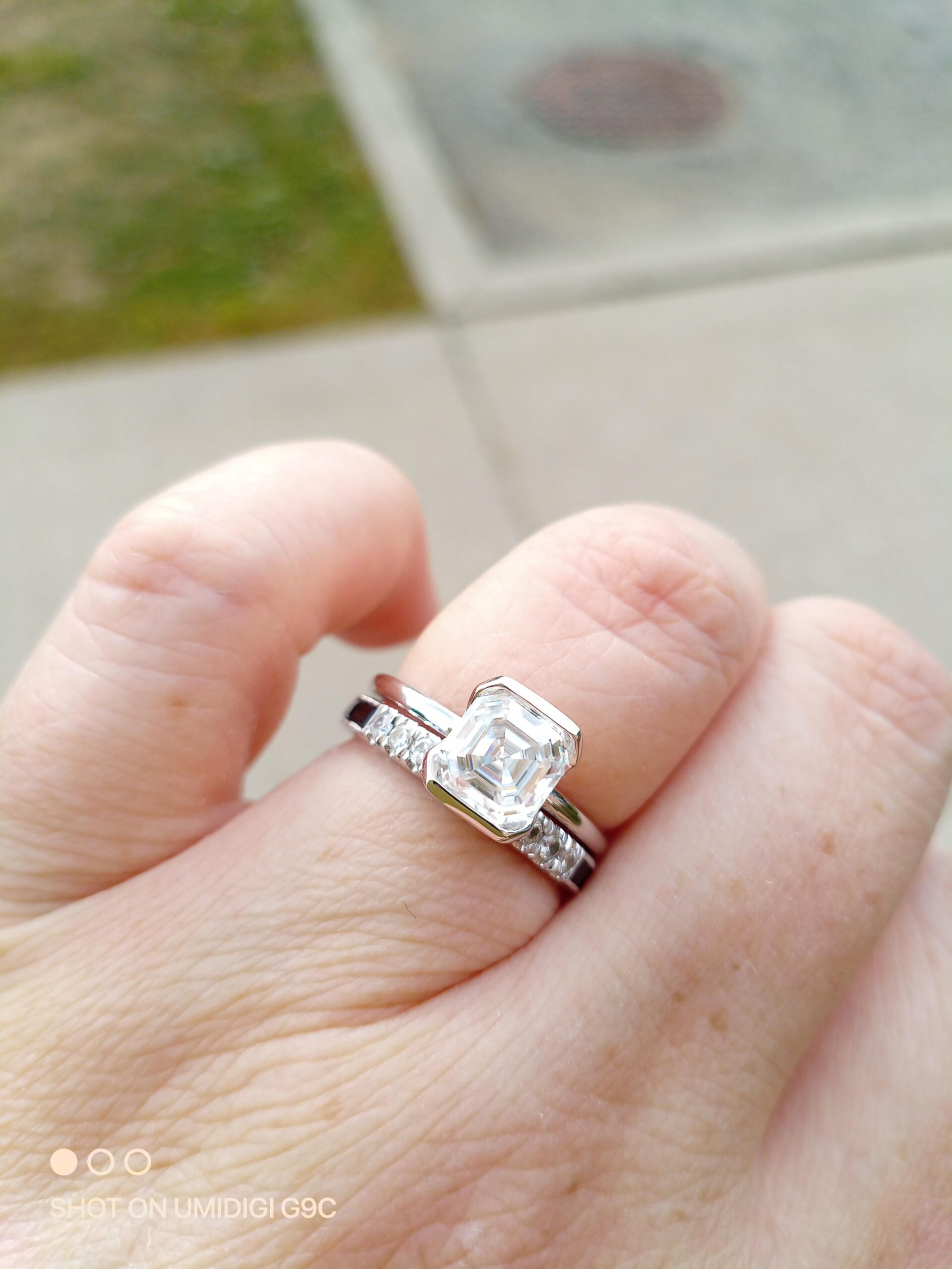 The symmetry of the asscher cut paired with the clean lines of the bezel is so visually satisfying. I love your ring. Congrats!