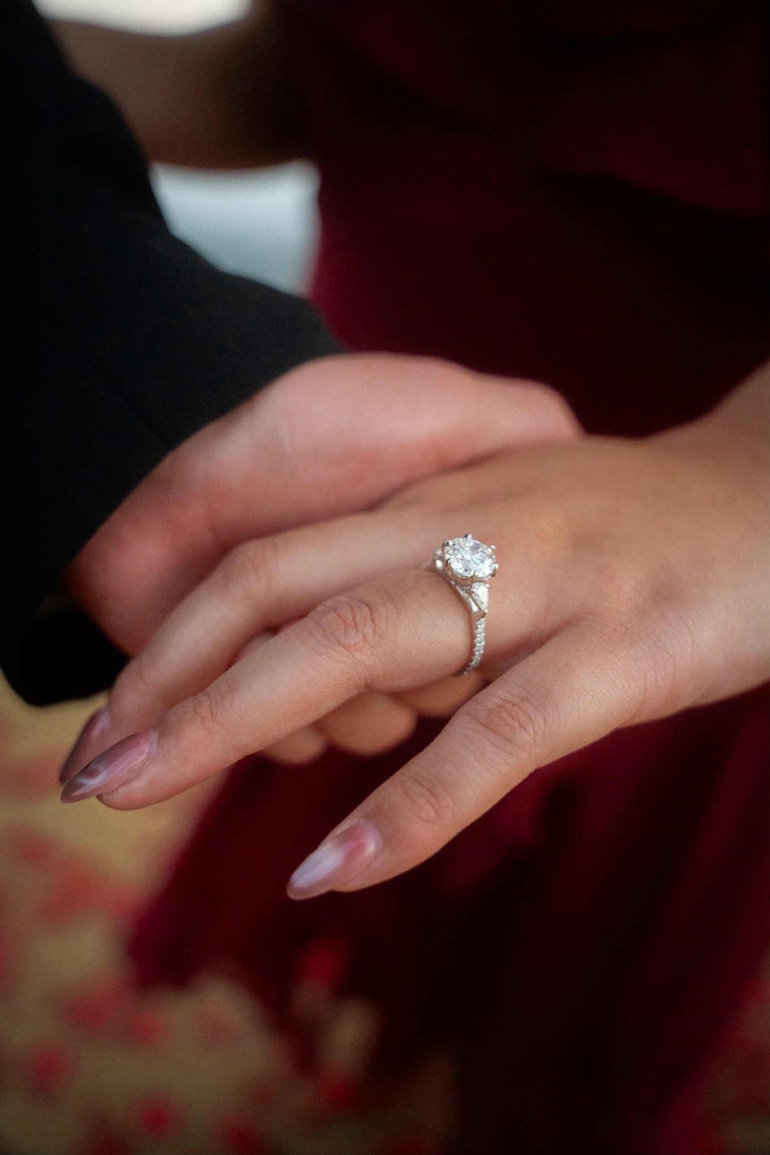 Let’s start with the star of the show—my engagement ring! It’s a delicate round-cut diamond, set in a vintage-inspired halo with gorgeous filigree detailing. 💖 The moment my fiancé slipped it onto my finger, I could hardly breathe; the sparkle was intoxicating!