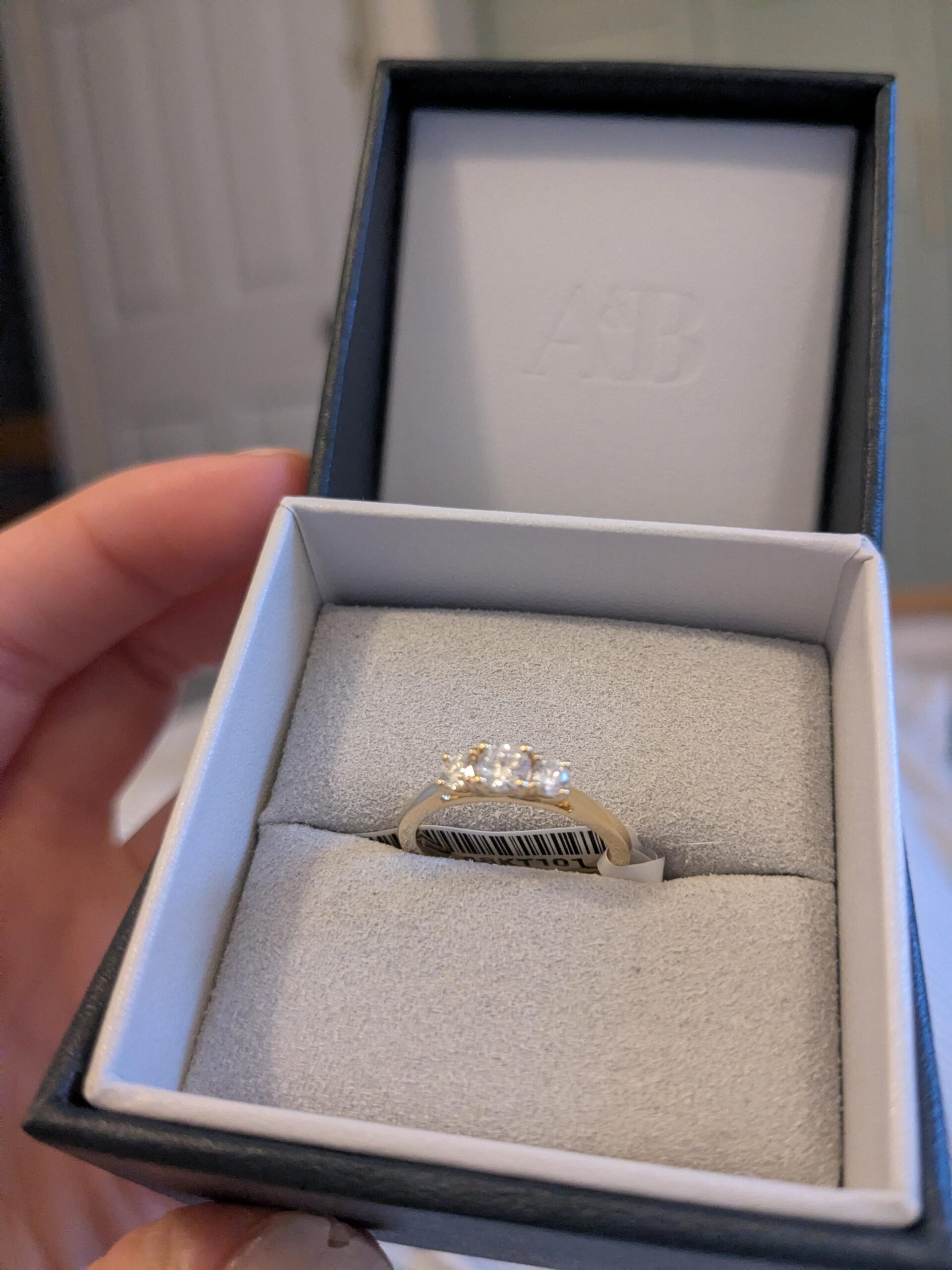 lol stop. my now fiance had this issue. the jeweller unfortunately didn’t have my size (4) at the time but he still proposed with the ring (6) that was too big on me. i had to wait 6 weeks until my actual ring size came in. my ring looks like this but in white gold. i love it. i’m sure she would love it too!