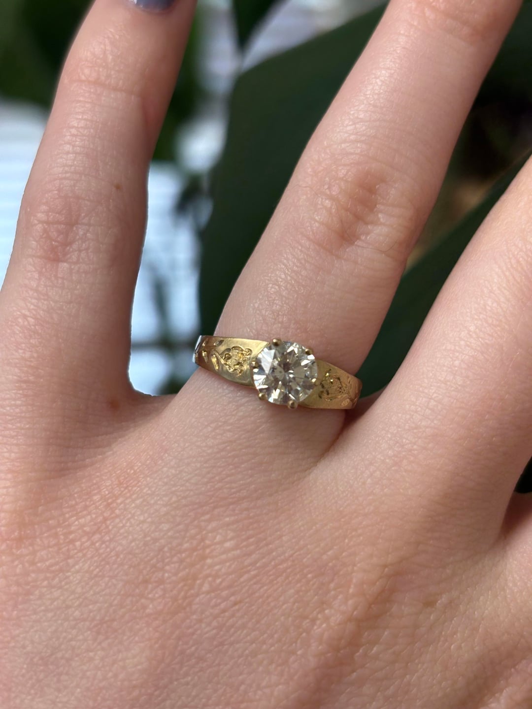 Itās a 1 carat diamond on a size 5 finger, hand-engraved 14k yellow gold
