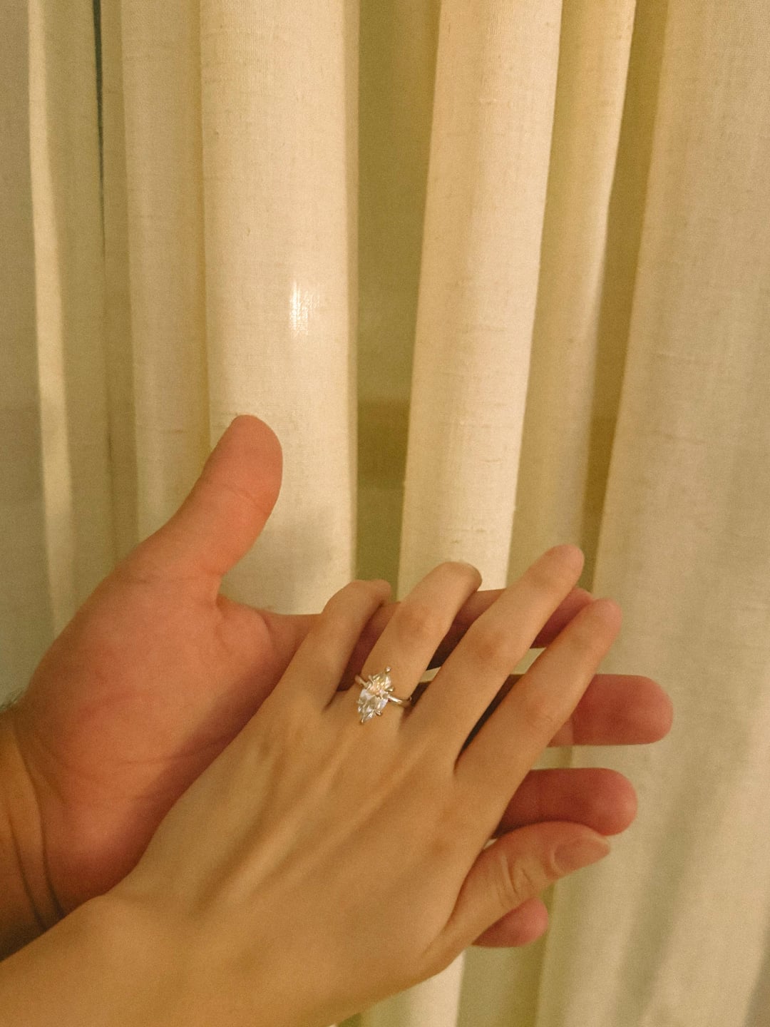Omg this is straight out of a movie. The marquise cut is so dreamy, it suits your hand perfectly! Huge congratulations, this is beyond beautiful!