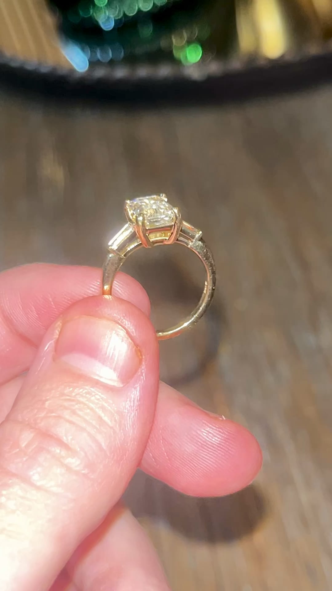 2ct center stone. Emerald cut. .25 carat tapered baguettes on the side. Lab