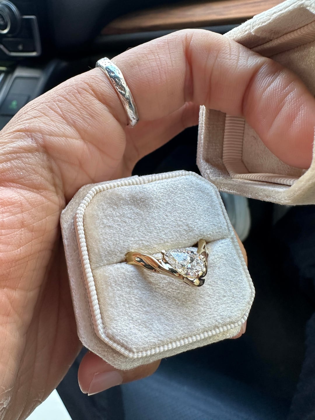I love the shape and the custom work is so beautiful. Congratulations and enjoy! Can’t wait to see what the wedding band looks like with it 🔥✨