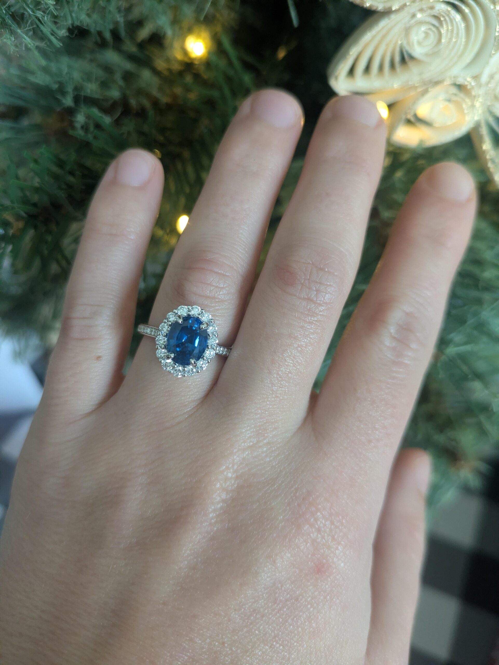Congratulations! 🥳✨ Absolutely love this! Beautiful colour of the sapphire. I love oval halo rings! Very Edwardian era inspired. Just be sure to monitor the stones on the band!