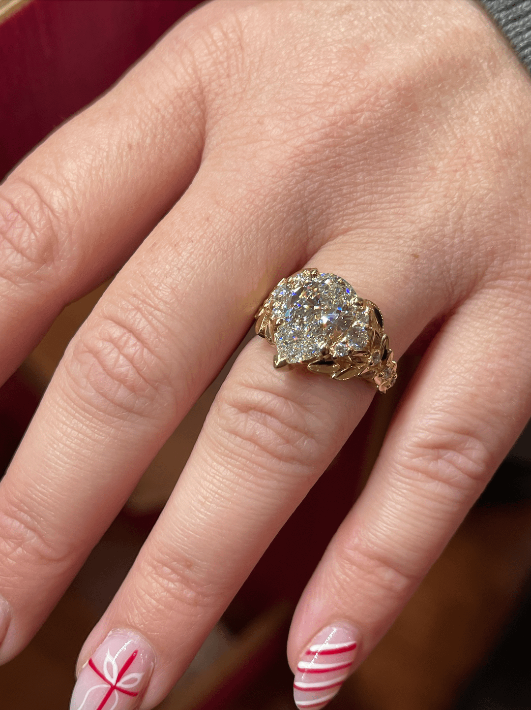 How special that your partner was able to take your references and come up with a gorgeous ring that you love! You two must communicate well because that is no easy feat! And the ring is just gorgeous; those leaves on the sides are so lovely! Truly a one of kind gorgeous ring!! Best wishes in your marriage!!!