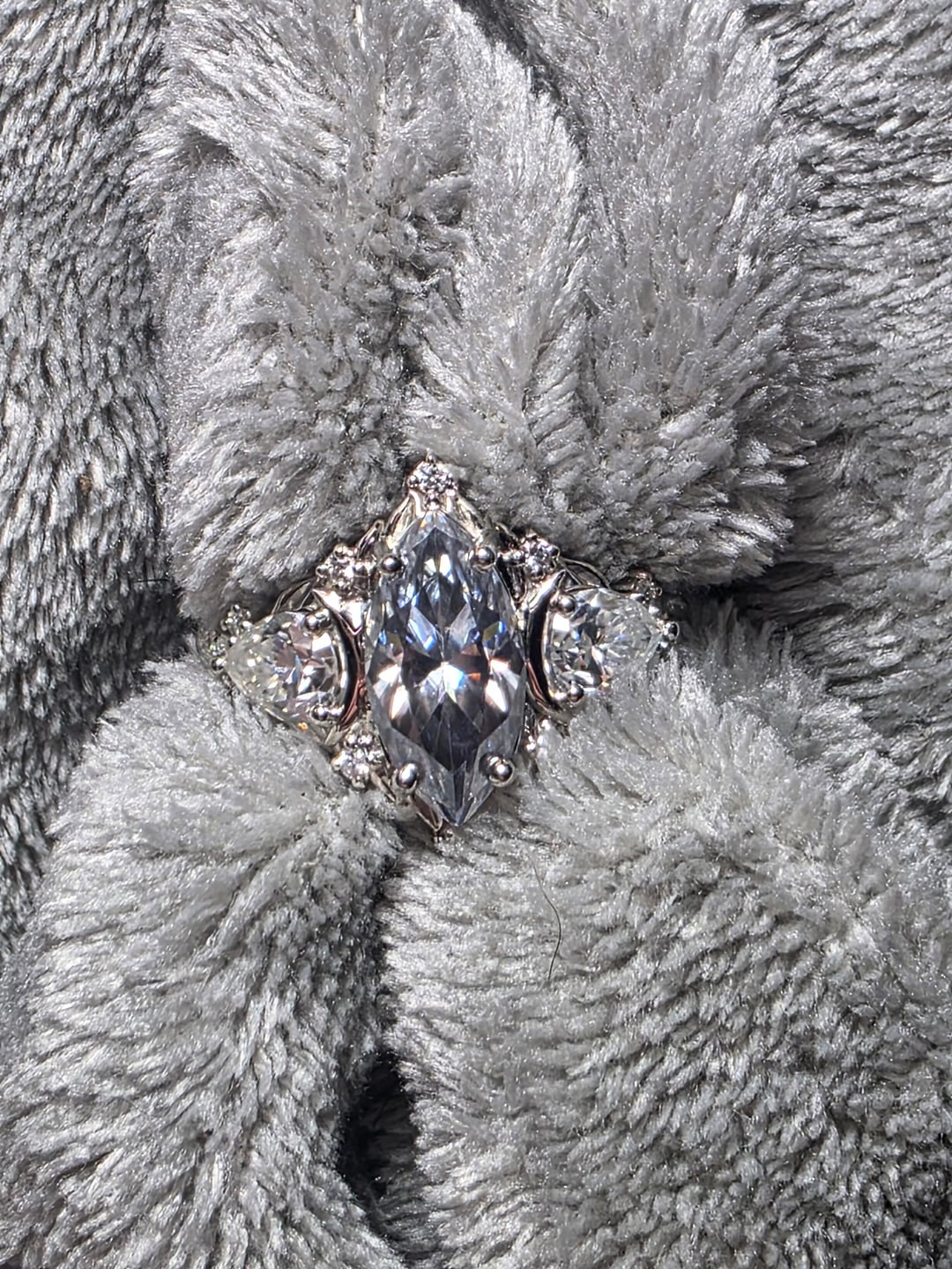So its an almost 3 carat center Grey moissanite. We did pear sides as he likes pear and it is a tears of sadness to joy meaning as 8nwas in a highly abusive relationship prior. The side stones look like a fairy and the moon and I did a petite twist for the band. From a distance the surround stones looking like stars twinkling. As we were opting for an ethical/whimsical/spacey look. I have the band as platinum due to severe allergies. I originally planned Montana Saphores for the mini stones but felt the colors would have been to much with having the center stone as a Grey color.