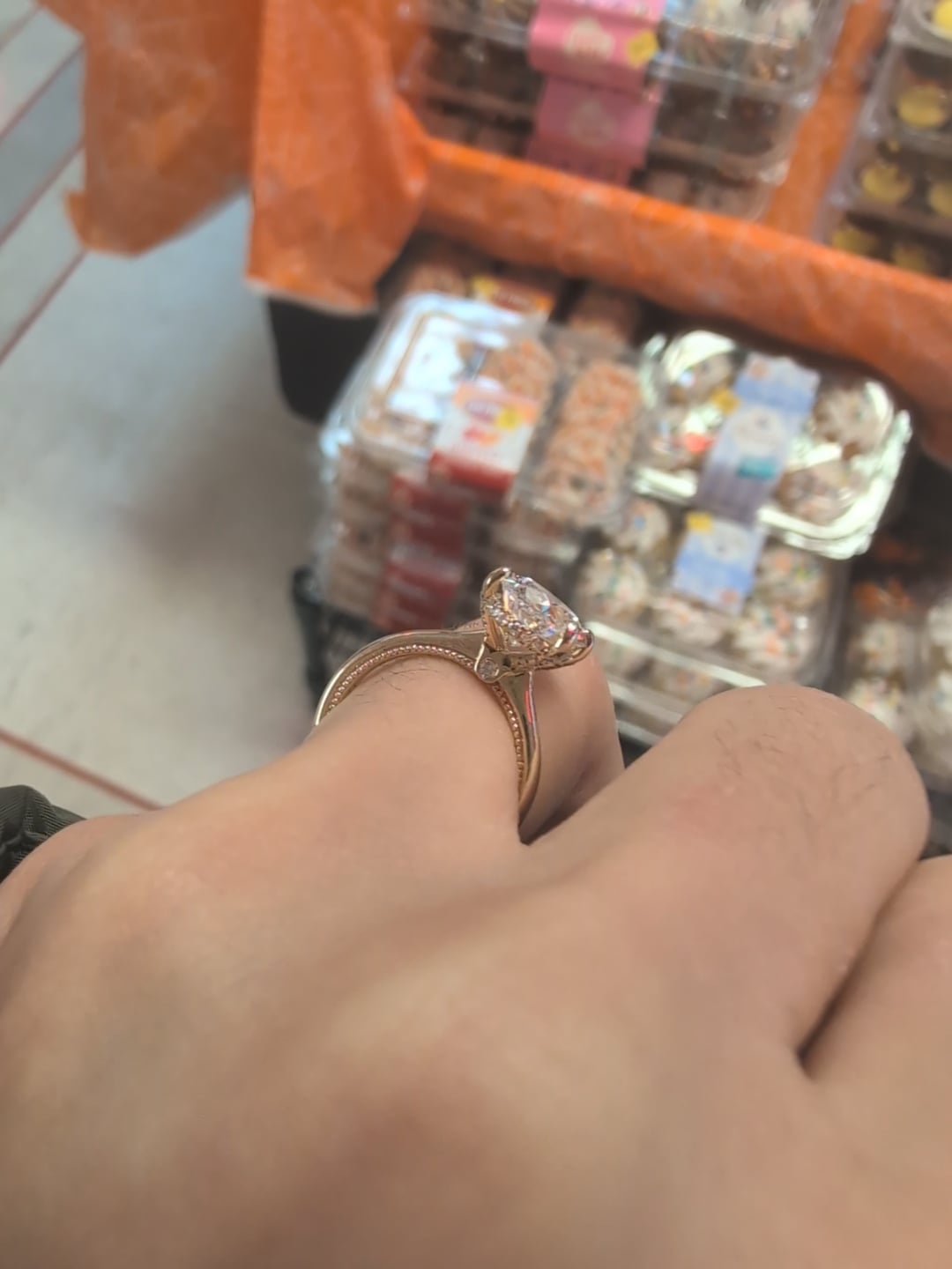 So pretty! Congrats! Is this a diamond or a moissanite? Only asking because I love, love, love the warmth of your stone and unsure if it’s because it may be a mossy or a warmer color stone. Can you share stats please? Including ratios. Your ring is literally perfect. Well done to your fiancé