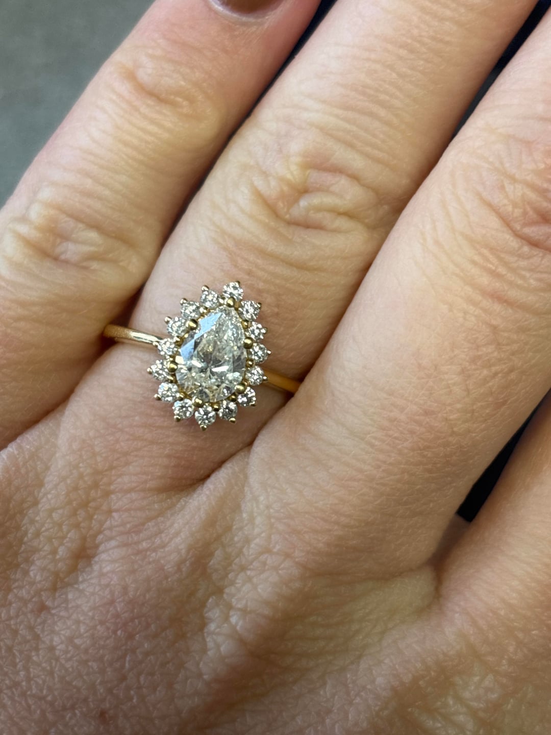 First, let me share the story behind my ring! It features a stunning oval diamond set in a delicate halo. I was drawn to the way the light dances around the stone, giving it an ethereal glow. The band is made of rose gold, which adds a warm touch and complements the diamond beautifully.