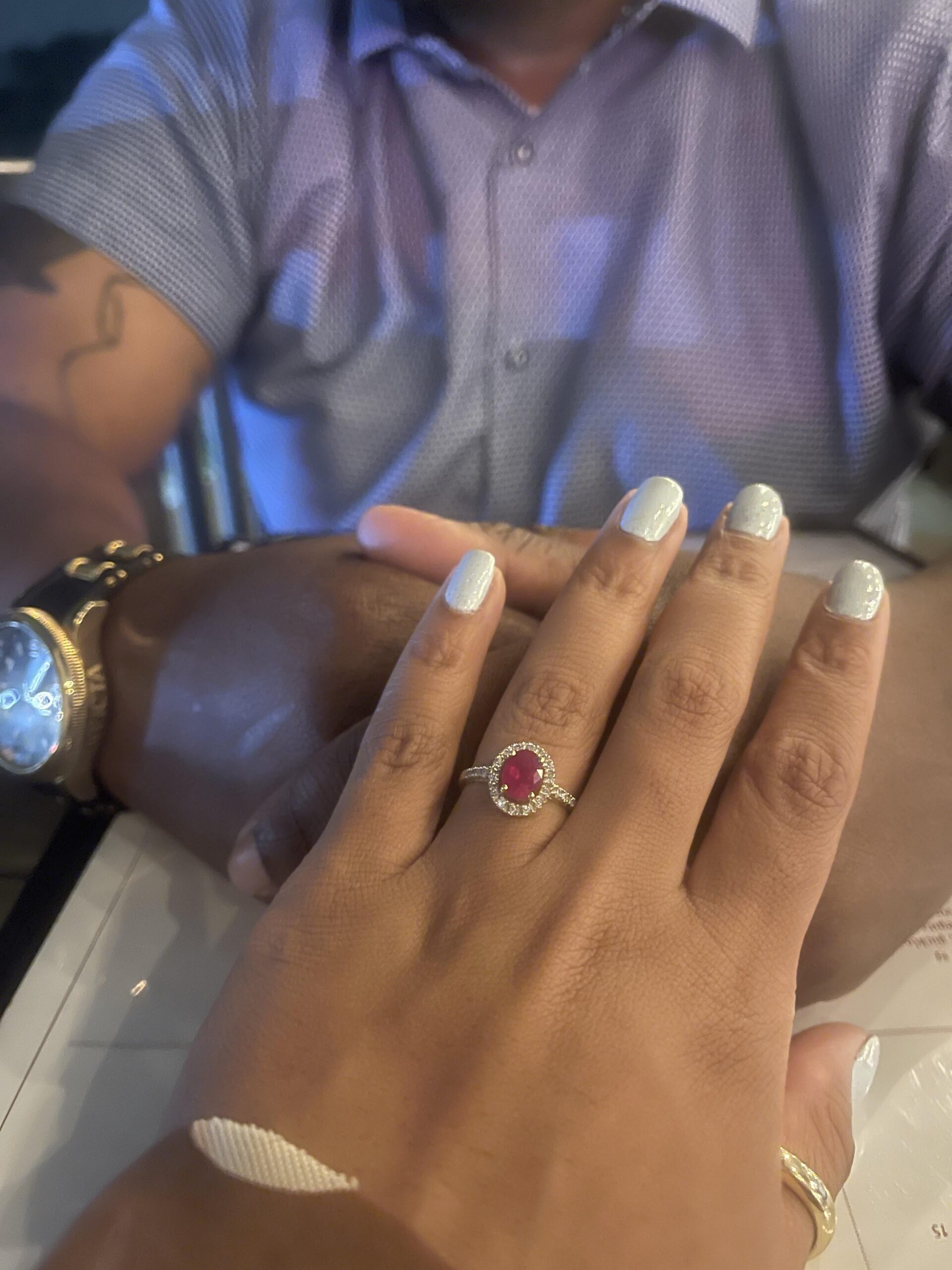 This stunner features a gorgeous oval diamond, nestled in a delicate halo setting with sparkling accents along the band. The moment I slipped it on my finger, I knew it was “the one.” It’s elegant yet unique—just like our love story!
