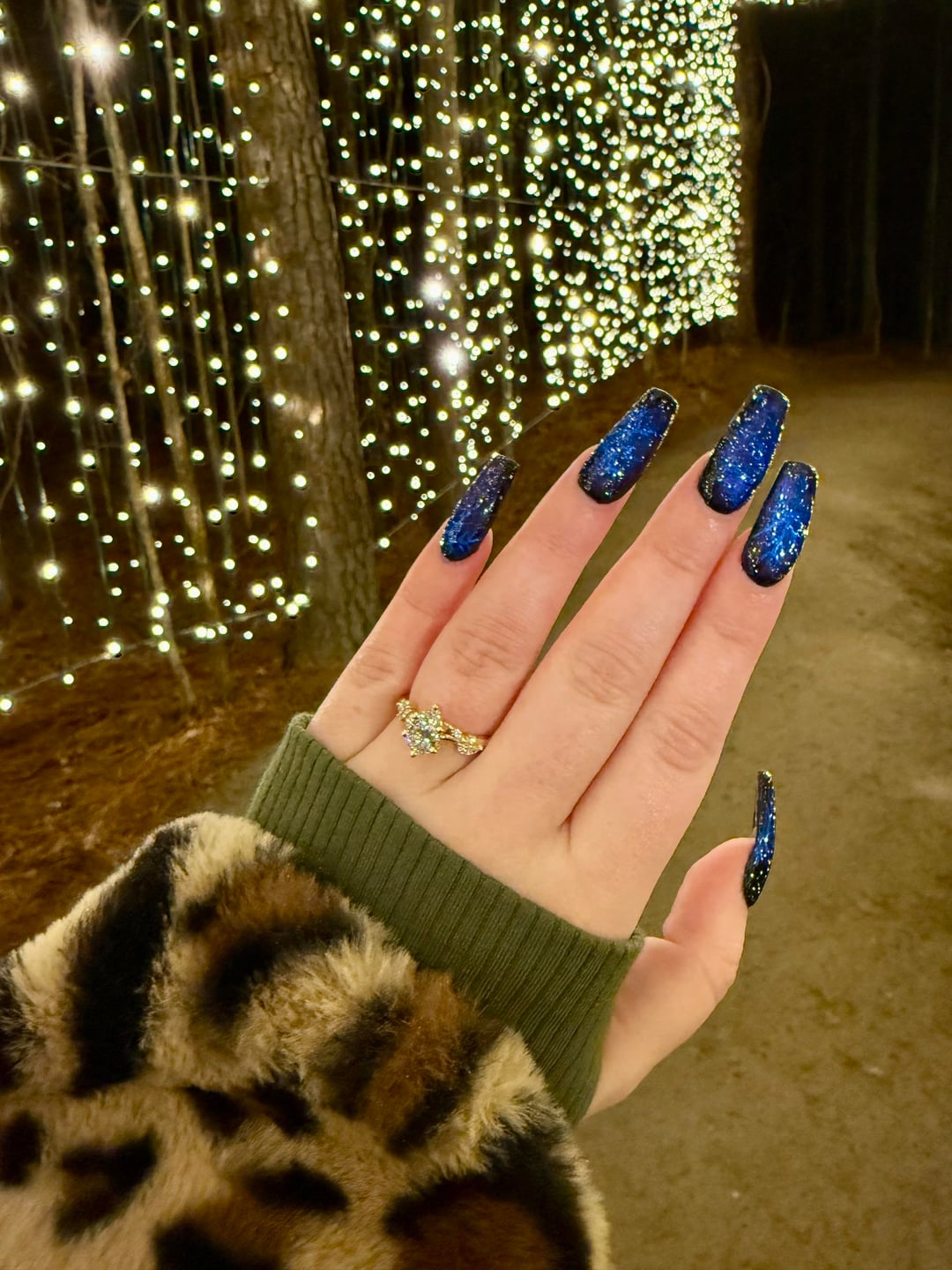 Oh my gosh, you two are so adorable! Congratulations, he did an excellent job with your beautiful engagement ring. Also, your nails look like the galaxy!