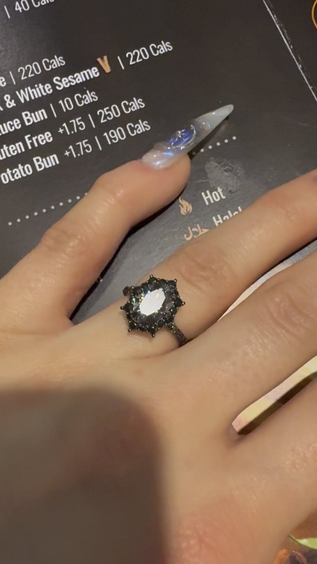 its stunning and so unique! i love it when the ring matches the nails, thats how you can tell your partner really gets your “vibe” 🙂 makes me smile every time. Happy engagement!