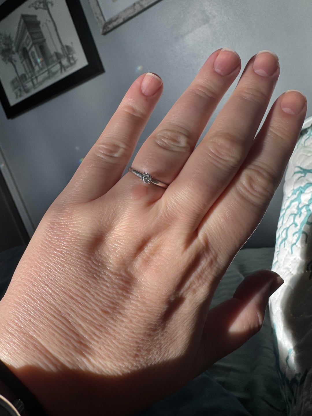 It’s obviously a good quality diamond the way it sparkles. Having a dainty ring is very practical for every day wear. It really is pretty. Congratulations on your engagement!