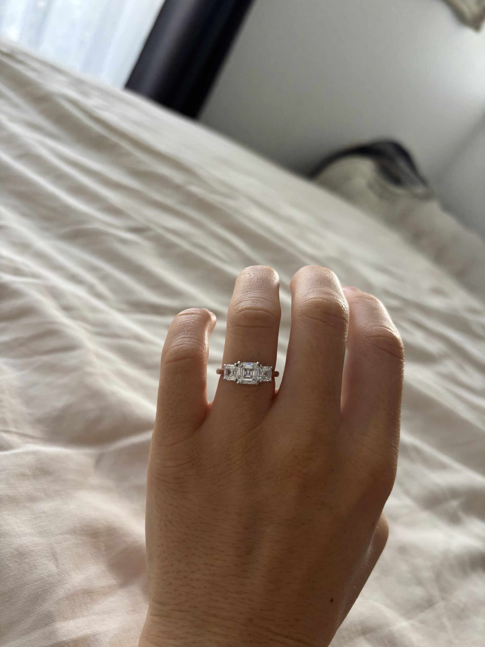 Today, I’m beyond excited to share an intimate peek into my heart (and hand) with my beloved three-stone Aascher engagement ring. This gem is not just a piece of jewelry; it represents our journey together, each stone symbolizing our past, present, and the bright future we’re building together.