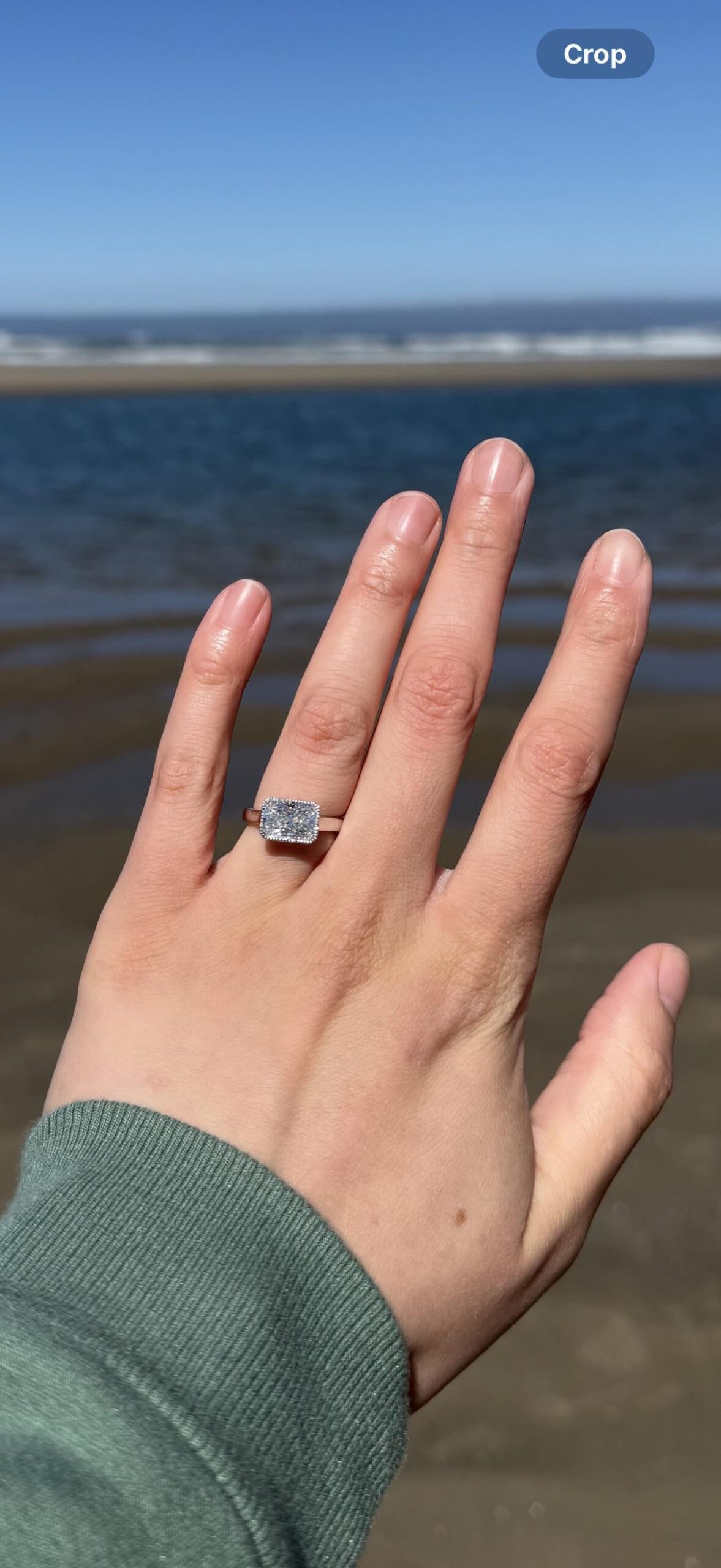 She’s a beauty! I love east west rings in all cuts. They’re my favorites. Congratulations on the engagement!