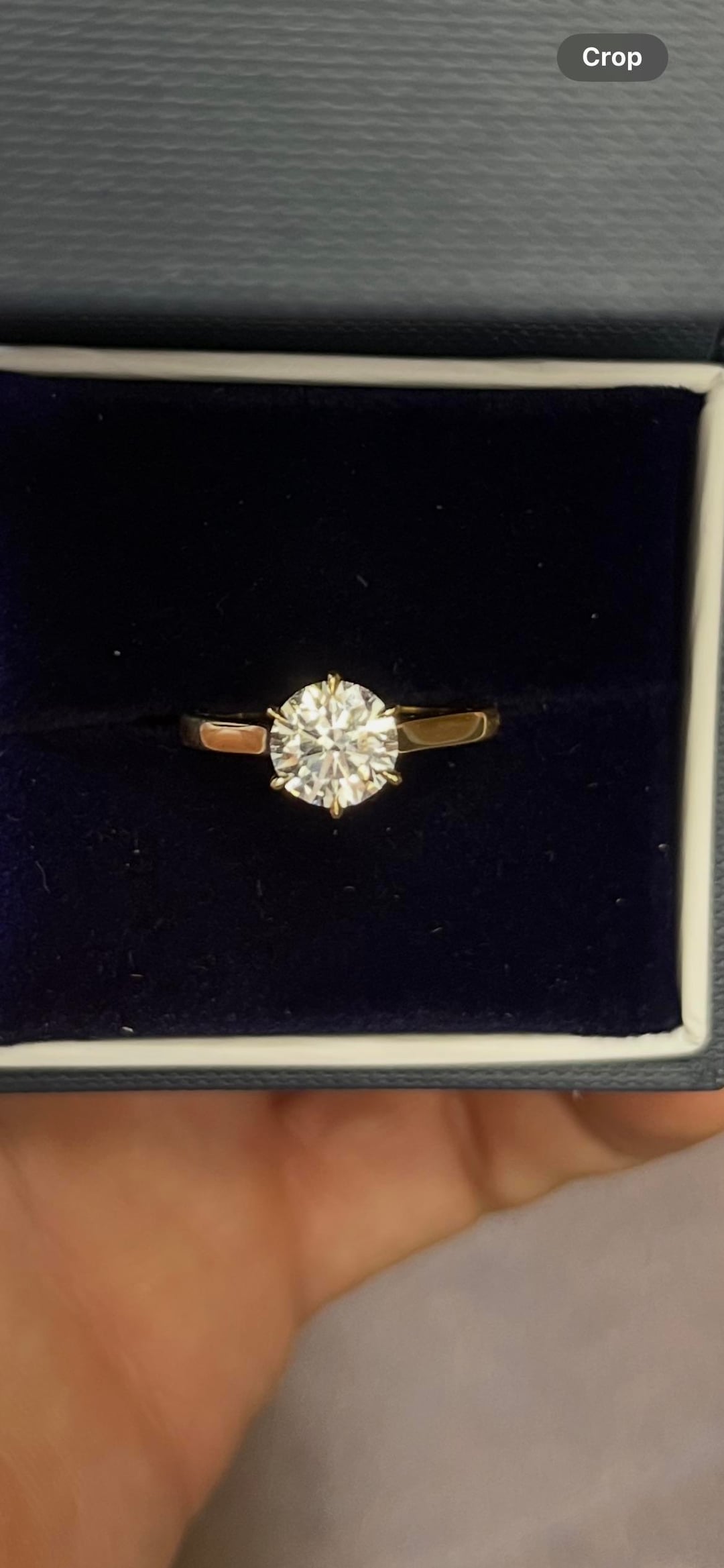 It’s beautiful! My only constructive comment would be that white gold or platinum prongs on the setting might make the diamond pop more. And on a diamond that size you don’t really need six prongs (unless that’s what she asked for.) I love six prongs but the jeweler and my fiancé convinced me that it can make the diamond look a little smaller. It’s an absolutely gorgeous ring and diamond. She’ll love it!!
