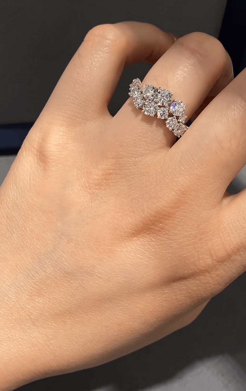 I got the ring from u/lilijewles. And it turns out to be lab diamonds with platinum, organic cluster layout (no center stone!!). The stones are all round, in different sizes, spaced in an asymmetric way. I love its sparkle in sunlight. It catches light from every angle but still sits low and comfortable. This is the first time I’ve ever worn something this “bridal” and actually felt like myself!