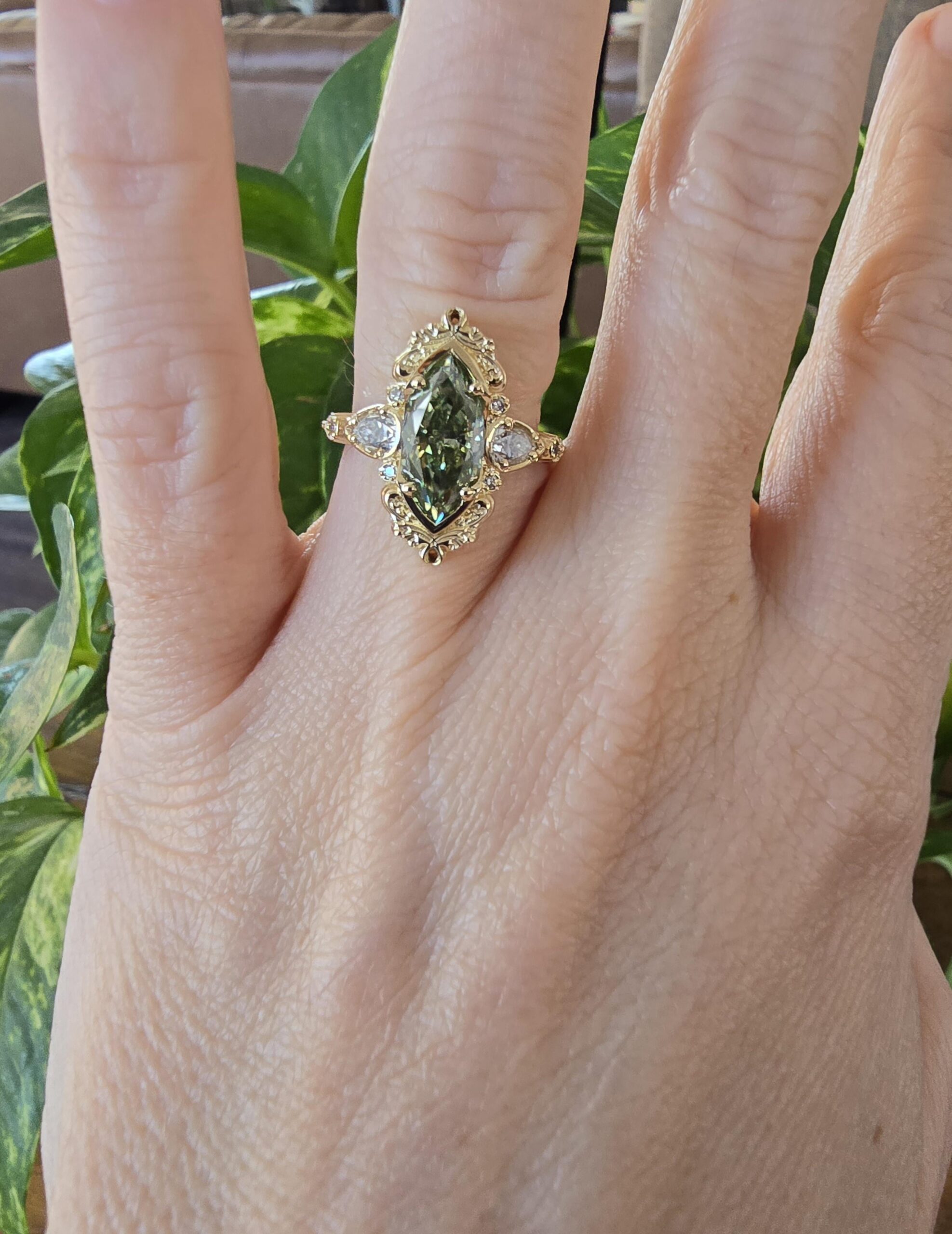 I like how distinctive and antique-looking this is. What’s the stone? Green lab diamond or something else?