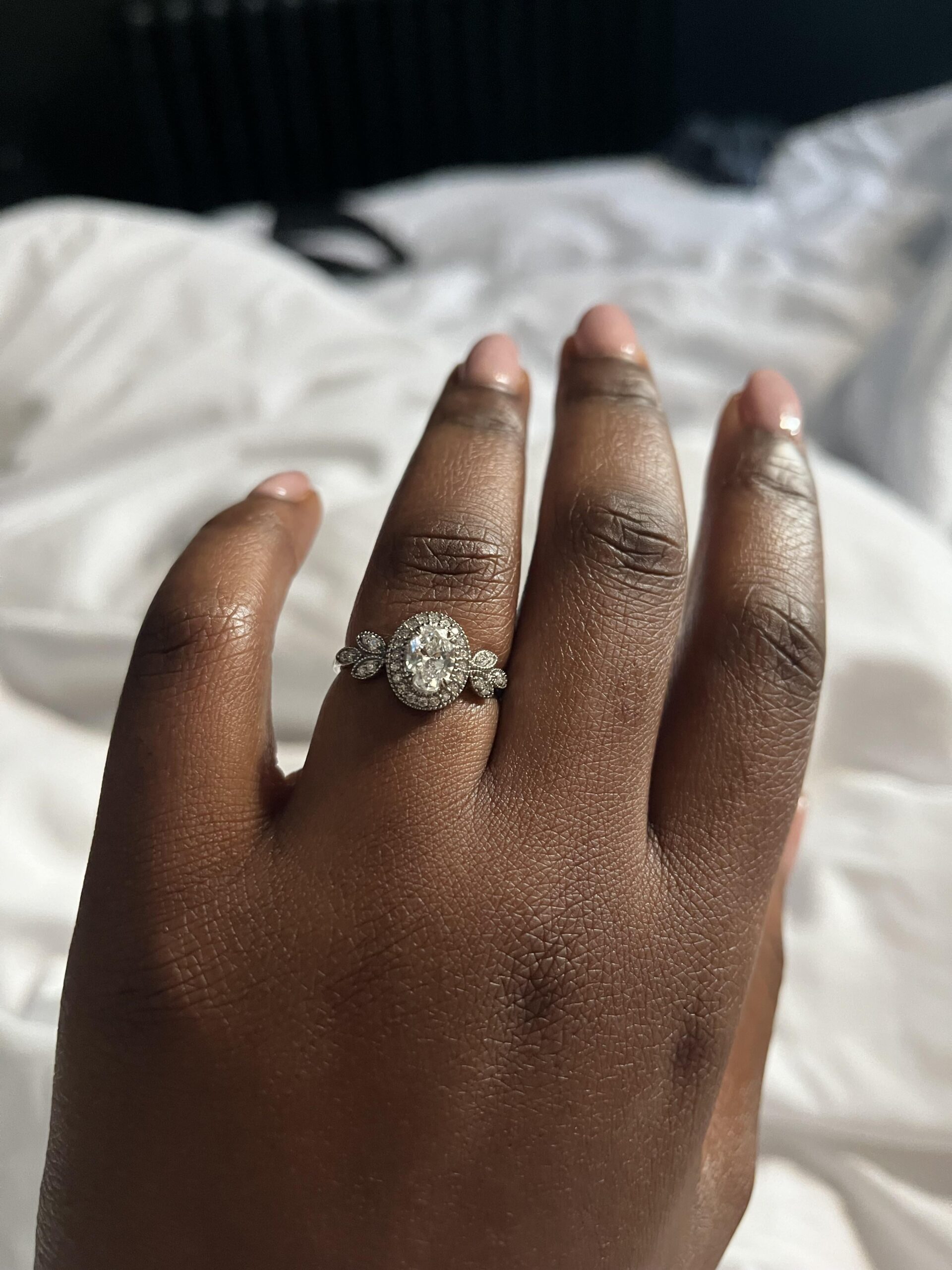 Ohhhh, it’s exquisite, the raised center stone, the milgrain around everything, the leafy side stones, it’s so unique and lovely. Congrats and wishes for a beautiful long life together, coming your way.
