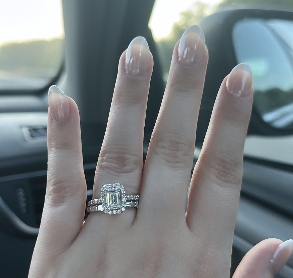 First off, let me just say, I couldn’t be happier with my choices! I have a stunning solitaire engagement ring paired with a delicate diamond-studded wedding band. And, for a little extra sparkle, I added a third band covered in rose gold to tie everything together!
