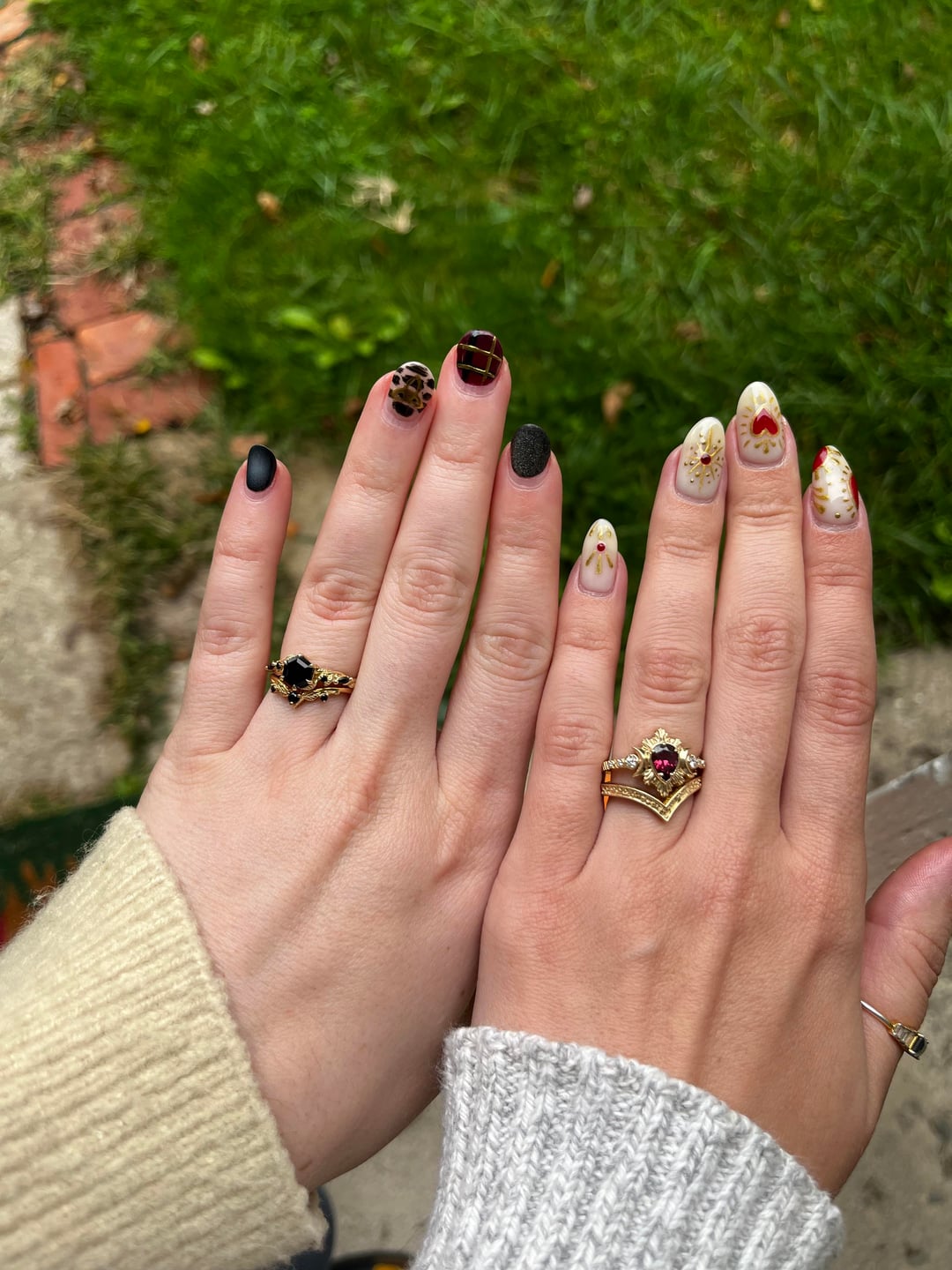 These are so gorgeous and I love that you each have nails matching the rings!!! Got a real ‘when light and dark collide, they fall in love’ vibe hahaha. Stunning on both sets, and congratulations to both of you!!