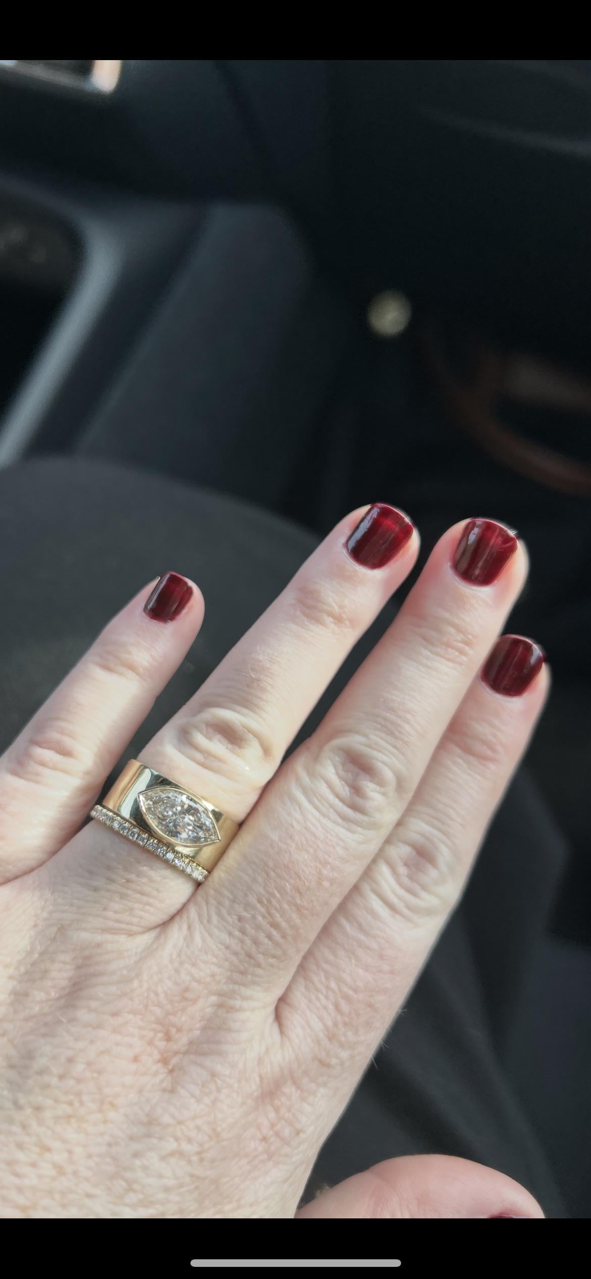 I’m not a fan of the EW setting for marquis or ovals etc, but your ring in particular is unique and gorgeous really. I think maybe the think wedding band with pave diamonds throws the eye a bit. Me personally, I reset the marquis NS on a white gold/plat band with the pave diamonds, sell the yellow gold and buy a gorgeous eternity band as the wedding band. But I guess I’m traditional (and old), there is zero wrong with your set – but having reset at least 5 diamonds in my life I feel that there is always the ‘maybe the next setting will be perfect!” 🙂 gorgeous set btw.